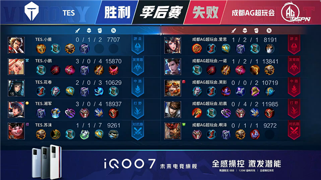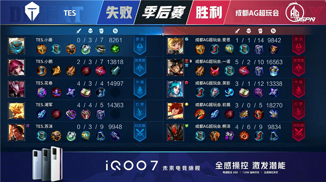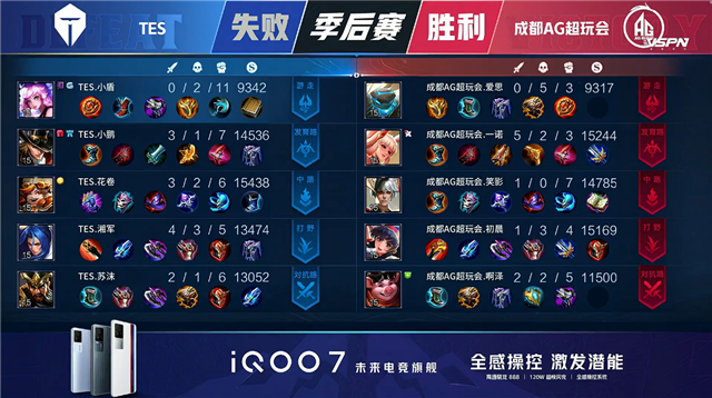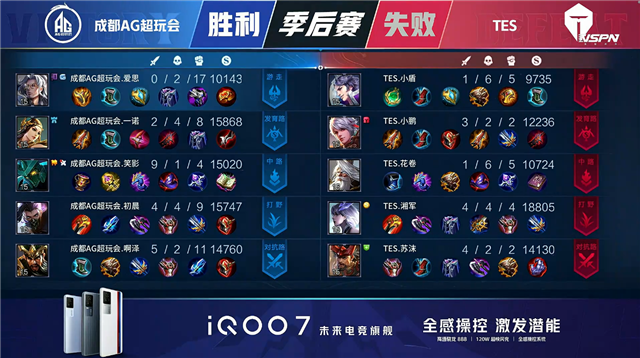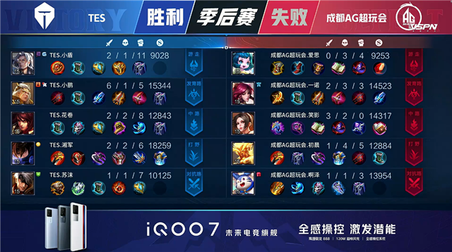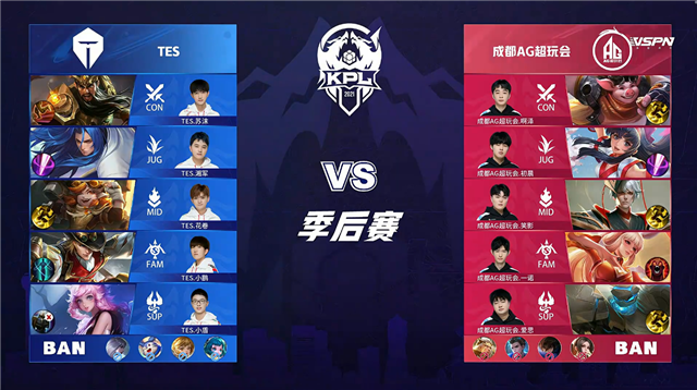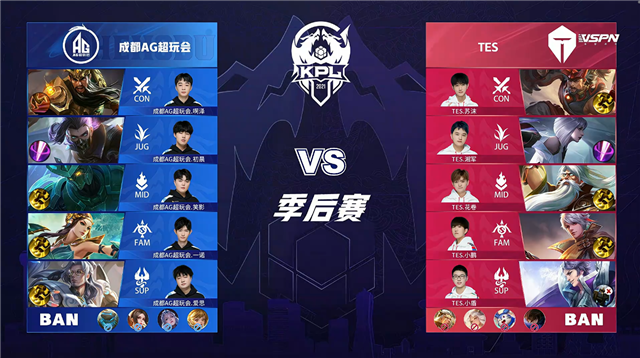 双方常规开局。1分08秒TES拿下中路河道之灵。2分38秒成都AG拿下暴君。5分01秒成都AG摧毁敌方下路外塔。5分53秒成都AG拿下主宰。6分12秒双方互换边路外塔。6分29秒双方中路1换1,成都AG拿下一血。7分23秒成都AG摧毁敌方下路二塔。7分30秒成都AG拿下暴君。8分20秒成都AG上路击杀沈梦溪并摧毁上路二塔。8分44秒上路团战成都AG打出0换2并摧毁敌方上路高地塔。10分24秒TES野区击杀盾山。10分39秒成都AG拿下暗影暴君。13分17秒中路上河道团战TES打出0换3。13分46秒TES摧毁敌方中路外、二塔。15分30秒野区团战TES打出0换3。15分51秒TES摧毁敌方下路二塔。16分07秒TES摧毁敌方中路高地塔。16分18秒TES高地上击杀公孙离。16分42秒TES拿下暗影暴君。18分30秒TES拿下暗影主宰。20分05秒高地团战TES击杀盾山。21分08秒中路团战成都AG打出2换5。21分40秒成都AG摧毁敌方中路二塔。21分54秒成都AG摧毁敌方水晶拿下比赛。