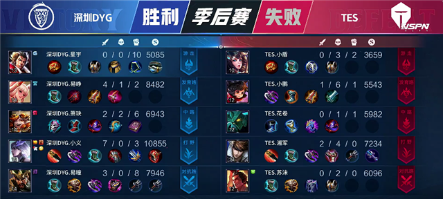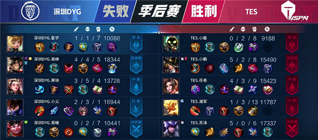 开局TES入侵野区,周瑜拿下一血。1分钟不知火舞击杀公孙离。2分30秒下路团战,TES打出1换2。4分40秒兰陵王推掉上路一塔。5分钟梦奇拿下主宰。5分40秒下路团战,双方1换1,小鹏公孙离推掉下路一塔。7分钟兰陵王拿下暴君。9分27秒兰陵王拿下主宰。10分15秒梦奇拿下主宰。11分钟小鹏公孙离推掉中路一塔。12分40秒兰陵王拿下暴君。13分25秒小鹏公孙离推掉下路二塔。14分30秒小鹏公孙离拿下主宰。15分10秒TES强攻中路二塔,双方1换1,TES推掉中路二塔。15分55秒兰陵王被击杀。16分50秒下路团战,TES打出1换2。17分20秒兰陵王拿下暴君。18分10秒吕布被击杀。19分10秒兰陵王拿下主宰。19分40秒深圳DYG下路双人组被击杀。19分56秒深圳DYG下路高地塔被破。TES顺势强攻高地,团战双方来回拉扯将近1分钟,TES打出1换3。20分51秒TES攻破水晶拿下本局比赛胜利。
