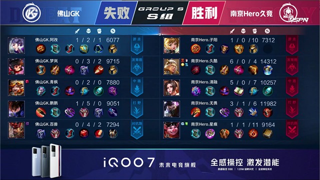 2分17秒,南京Hero裴擒虎拿下暴君。5分15秒,南京Hero拿下先知主宰。5分52秒,南京Hero破掉佛山GK上一塔。6分35秒,南京Hero控下暴君。8分03秒,佛山阿古朵配合关羽击杀裴擒虎拿下一血。8分14秒,佛山GK中路击杀西施。9分29秒,佛山GK控下先知主宰。11分29秒,南京Hero拿下暗影暴君。12分37秒,南京Hero中路击杀周瑜,随后破掉佛山GK中一塔。13分01秒,南京Hero控下暗影主宰。13分55秒,南京Hero破掉佛山GK下二塔。15分42秒,南京Hero控下暗影暴君。16分47秒,南京Hero强推掉佛山GK中二塔。17分23秒,南京Hero控下暗影主宰。18分30秒,野区团,佛山GK打出0换4。19分19秒,佛山GK强推掉南京Hero下高地。22分06秒,佛山GK击杀裴擒虎。22分48秒,佛山GK控下风暴龙王。23分35秒,佛山GK破掉南京Hero上二塔。23分50秒,佛山GK击杀裴擒虎随后破掉南京Hero中二塔。24分21秒,佛山GK先后破掉南京Hero上中、高地。24分55秒,南京Hero高地反打打出1换3。25分45秒, 南京Hero反推掉佛山GK中高地。27分50秒,南京Hero抢到风暴龙王,随后团战打出1换3。28分29秒,南京Hero击杀敌方最后两人后摧毁水晶赢下比赛!