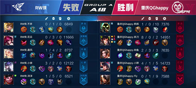 开局RW侠入侵野区拿下蓝Buff。1分10秒RW侠再次入侵野区,娜可露露拿下一血,团战RW侠打出1换1。2分钟镜在上路击杀夏侯惇。2分30秒嫦娥拿下暴君。3分35秒镜拿下主宰。4分35秒镜单杀不知火舞。5分20秒镜被击杀。6分钟重庆QGhappy推掉上路一塔。6分55秒上路团战,双方1换1,RW侠推掉上路一塔。7分20秒镜拿下暴君。7分56秒RW侠推掉中路一塔。9分09秒RW侠推掉下路二塔。10分55秒下路团战,猪八戒被击杀。12分20秒中路团战,重庆QGhappy打出0换4,孙尚香拿下三杀。13分钟RW侠上路高地塔被破。13分50秒重庆QGhappy推掉中路一塔。14分57秒娜可露露拿下暴君。15分38秒中路团战, 重庆QGhappy打出1换3,孙尚香拿下双杀。16分02秒孙尚香直上高地推掉上水晶拿下本场比赛胜利。