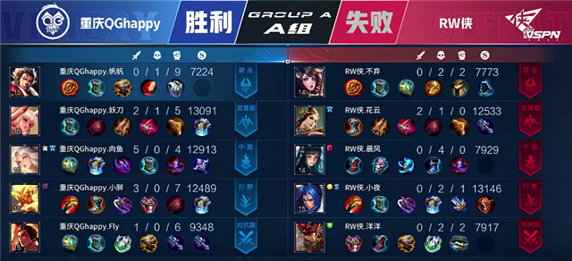 开局双方平稳开局。2分11秒橘右京拿下主宰。2分35秒盘古拿下暴君。3分22秒上河道团战,嫦娥拿下一血。5分41秒公孙离推掉下路一塔。6分26秒虞姬抢下主宰。6分48秒橘右京推掉上路一塔。7分34秒盘古拿下暴君。8分24秒双方互换边路一塔。9分30秒野区团战,大乔被击杀。10分10秒西施被击杀。10分44秒盘古拿下暴君。12分45秒重庆QGhappy强推中路一塔,西施被击杀。12分50秒虞姬推掉上路二塔。13分35秒盘古拿下主宰。14分17秒橘右京被击杀。14分40秒重庆QGhappy强攻上路二塔,西施被击杀。15分钟RW侠中路高地塔被破,团战RW侠打出1换2。15分50秒橘右京拿下暴君。16分钟RW侠推掉中路一塔。16分20秒上河道团战,重庆QGhappy打出0换3,公孙离拿下双杀。重庆QGhappy顺势上路一塔强推高地,团灭RW侠。17分13秒重庆QGhappy点掉水晶率先拿下一分。