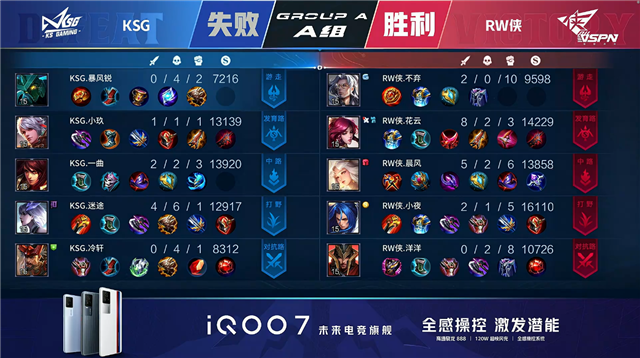 双方常规开局,1分38秒野区团战RW侠打出0换2。2分10秒KSG中路击杀嫦娥。2分34秒双方上路1换1。3分51秒RW侠下路击杀百里守约。4分30秒KSG野区击杀橘右京。5分57秒RW侠上路击杀镜。6分36秒RW侠野区击杀镜。7分13秒KSG摧毁敌方中路外塔。9分44秒RW侠拿下主宰。10分46秒RW侠上路击杀镜。11分04秒RW侠拿下暗影主宰。12分12秒RW侠野区打出0换2。12分28秒RW侠摧毁敌方上路高地塔。13分04秒RW侠拿下暗影暴君。15分35秒RW侠中路击杀墨子。15分54秒RW侠摧毁敌方中路高地塔并击杀廉颇。16分14秒双方下路1换1。17分31秒RW侠拿下暗影暴君。18分30秒RW侠野区击杀伽罗。19分24秒RW侠上路击杀镜。RW侠上路打出1换2。19分58秒RW侠摧毁敌方水晶拿下比赛。