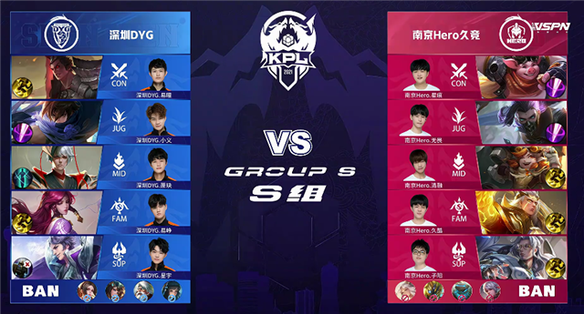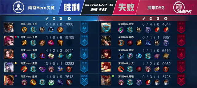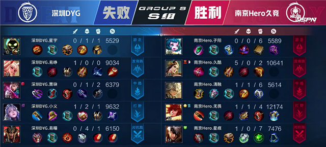 双方平稳开局。2分26秒镜拿下暴君。2分40秒中路团战,周瑜拿下一血。4分10秒裴擒虎在上路被击杀。4分20秒南京Hero久竞推掉下路一塔。4分35秒野区团战,南京Hero久竞打出0换2。5分30秒镜拿下主宰。6分40秒伽罗推掉上路一塔。7分钟镜拿下暴君。8分20秒南京Hero久竞推掉中路一塔,盾山被击杀。8分41秒南京Hero久竞推掉下路二塔。9分40秒南京Hero久竞强推上路二塔,团战南京Hero久竞打出0换2。10分25秒镜拿下暴君。11分50秒南京Hero久竞推掉中路二塔。12分钟镜拿下主宰。13分钟南京Hero久竞强推下路高地塔,团战打出1换2。南京Hero久竞顺势进攻水晶,13分39秒南京Hero久竞团灭深圳DYG推掉水晶追平比分。