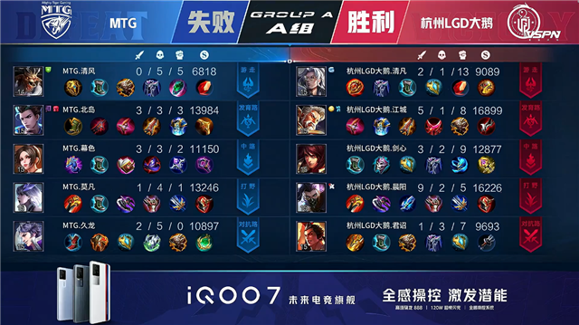 开局MTG射手中路抢线。4分06秒MTG上路打出0换2,杭州LGD大鹅中路击杀牛魔。4分40秒双方暴君处打出1换1。6分53秒MTG拿下暴君。7分24秒杭州LGD大鹅野区击杀不知火舞。7分52秒杭州LGD大鹅中路打出0换2。7分56秒杭州LGD大鹅上路击杀刘邦。8分17秒杭州LGD大鹅摧毁敌方中路外塔。11分22秒上路团战MTG打出4换5。13分36秒MTG拿下暗影暴君。14分30秒中路团战杭州LGD大鹅打出0换3。14分59秒杭州LGD大鹅摧毁敌方中路二塔。15分18秒杭州LGD大鹅拿下暗影主宰。17分03秒杭州LGD大鹅上路击杀刘邦。17分17秒杭州LGD大鹅摧毁敌方上路二塔,MTG摧毁敌方下路二塔。17分35秒杭州LGD大鹅摧毁敌方上路高地塔。17分49秒杭州LGD大鹅野区击杀镜。18分20秒杭州LGD大鹅摧毁敌方中路高地塔,MTG击杀吕布。18分51秒杭州LGD大鹅中路击杀不知火舞。19分01秒杭州LGD大鹅上路兰陵王单杀刘邦。19分39秒杭州LGD大鹅摧毁敌方水晶拿下比赛。