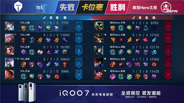 双方平稳开局。2分20秒TES拿下第一条暴君,2分45秒南京Hero澜击杀东皇太一拿下一血。4分09秒TES蹲草击杀西施,拆掉南京Hero下路一塔。6分10秒中路团TES击杀猪八戒,7分39秒团战双方1换1。10分20秒TES拿下暗影暴君,11分10秒南京Hero拿下暗影主宰。15分17秒TES拿下暗影暴君,团战双方1换1,TES拆掉南京Hero中路一塔。16分16秒下路团双方TES击杀澜拆掉南京Hero下路二塔,16分40秒TES打出0换2。17分37秒TES拿下暗影主宰,18分25秒南京Hero击杀东皇太一。19分49秒南京Hero拆掉TES中路一塔,21分04秒南京Hero击杀东皇太一。21分15秒团战南京Hero打出0换4,TES仅剩百里守约一人无力防守,被一波拆掉水晶。