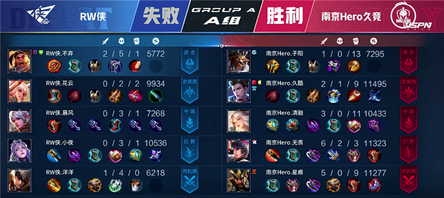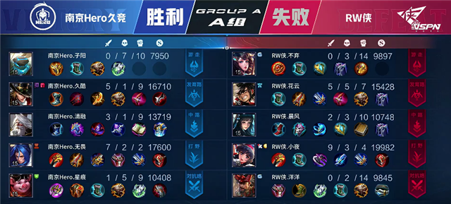 双方平稳开局。2分11秒露娜拿下暴君。2分45秒野区团战,南京Hero久竞打出0换2,关羽拿下一血。3分50秒狄仁杰被击杀。4分50秒苏烈被击杀。5分10秒RW侠下路二塔被破。5分45秒中路团战,南京Hero久竞打出0换2。6分10秒南京Hero久竞推掉中路一塔。6分30秒南京Hero久竞推掉下路二塔。6分50秒娜可露露拿下暴君。7分钟娜可露露击杀苏烈。7分24秒南京Hero久竞推掉中路二塔。8分20秒狄仁杰推掉上路二塔。8分45秒苏烈被击杀。9分25秒双方打野被击杀。10分25秒夏侯惇被击杀。10分40秒娜可露露拿下暴君。11分20秒娜可露露拿下主宰。12分20秒嫦娥单杀公孙离。12分30秒南京Hero久竞推掉中路和上路高地塔,团战中娜可露露被击杀。14分钟苏烈被击杀。14分30秒狄仁杰推掉下路高地塔,高地团战南京Hero久竞团灭RW侠,关羽拿下三杀。14分52秒南京Hero久竞攻破水晶拿下本场比赛胜利。