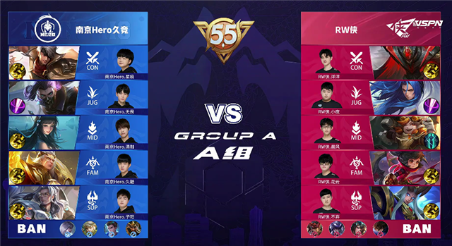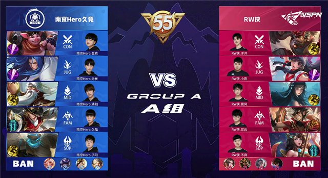 双方平稳开局。2分20秒暴君团,南京Hero久竞打出1换3,橘右京拿下一血,夏侯惇拿下双杀,RW侠拿下暴君。3分50兰陵王拿下主宰。4分10秒西施被橘右京蹲草击杀,沈梦溪越塔被击杀。4分53秒沈梦溪被击杀。5分45秒野区团战,双方1换1。6分40秒沈梦溪被击杀。6分55秒东皇太一被击杀。7分15秒橘右京推掉下路一塔。7分20秒兰陵王拿下暴君。8分40秒后羿推掉上路一塔。9分10秒东皇太一被击杀。9分20秒兰陵王单杀橘右京。10分10秒上河道团战,后羿拿下双杀。10分45秒后羿拿下主宰。11分47秒后羿推掉上路二塔。12分13秒兰陵王拿下暴君。12分40秒双方互换边路二塔。12分55秒RW侠中路一塔被破。13分钟橘右京被击杀。13分50秒白起被击杀,RW侠中路二塔被破。15分钟兰陵王拿下主宰。16分54秒后羿拿下暴君。17分20秒南京Hero久竞强攻下路高地塔,白起和橘右京被击杀。南京Hero久竞顺势转中,推掉中路高地塔强攻水晶。18分04秒南京Hero久竞推掉水晶率先拿下赛点。