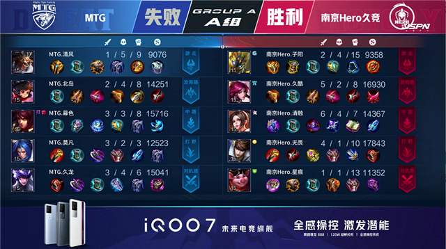 2分28秒,南京Hero不知火舞击杀马超拿下一血。3分10秒,MTG拿下暴君。5分15秒,南京Hero伽罗上路击杀马超,随后破掉MTG上一塔。5分38秒,南京Hero中路击杀牛魔。6分40秒,中路团,MTG打出1换2。8分12秒,中路团,MTG再次打出1换2,随后破掉南京Hero上二塔。8分58秒,MTG周瑜烧掉南京Hero中一塔。9分36秒,MTG破掉南京Hero下二塔。10分45秒,暴君团,MTG打出1换3。11分23秒,MTG拿下暗影暴君。12分15秒,MTG拿下暗影主宰。13分22秒,MTG破掉南京Hero中二塔。15分40秒,MTG拿下暗影暴君。16分42秒,中路团,南京Hero打出1换2。19分19秒,南京Hero拿下暗影主宰,随后团战南京Hero打出1换2。20分钟,双方团,南京Hero打出2换3。23分11秒,中路团,南京Hero打出1换5团灭对手。23分58秒,南京Hero上路平推摧毁MTG水晶3:0赢下比赛。