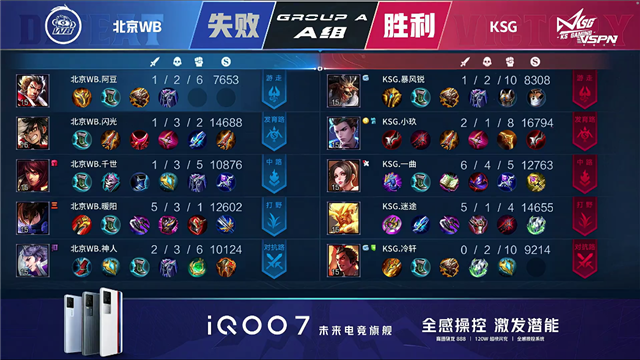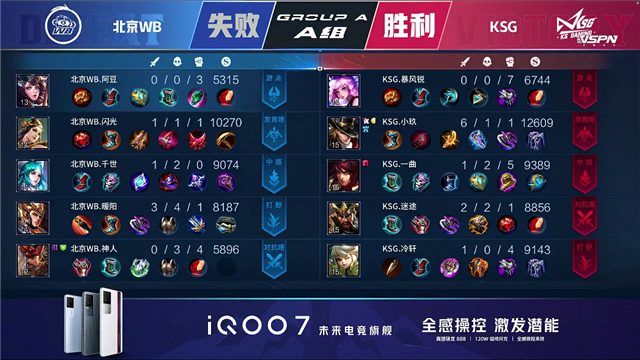 双方平稳开局,2分11秒KSG拿下第一条暴君,北京WB拿下先知主宰。5分47秒上路团北京WB娜可露露击杀夏侯惇拿下一血并拆掉KSG上路一塔,中路团北京WB击杀镜。7分33秒KSG镜击杀娜可露露,7分46秒KSG拆掉北京WB中路一塔,8分钟KSG拆掉北京WB下路一塔。10分53秒团战北京WB打出2换4,11分15秒北京WB拿下暗影暴君,12分20秒北京WB击杀夏侯惇。14分钟KSG上下路二塔被破,15分45秒北京WB拿下暗影暴君,16分58秒北京WB拿下暗影主宰。17分56秒北京WB击杀刘邦,18分11秒北京WB拆掉KSG中路一塔,团战打出1换3,18分50秒北京WB带领上路兵线一波强拆KSG水晶。