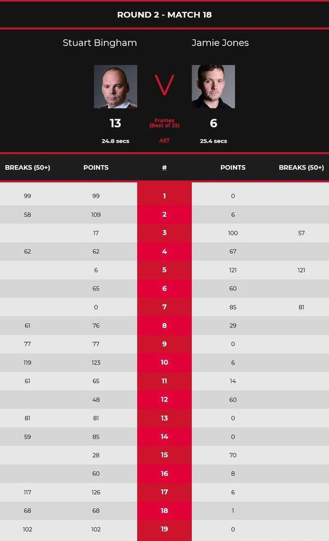 第1局,宾汉姆长台上手,单杆99分拿下。第2局,宾汉姆长台上手单杆58分,琼斯没有解到,宾汉姆打进一颗红球防守,宾汉姆单杆46分拿下。宾汉姆2-0。第3局,宾汉姆打进红球,母球摔袋;琼斯单杆39分防守;琼斯防守留下机会,宾汉姆单杆17分,失误;琼斯单杆57分拿下。第4局,琼斯单杆40分,宾汉姆长台上手单杆62分,点位黄球失误,琼斯单杆27分清彩以67-62拿下。琼斯2-2进入局休。