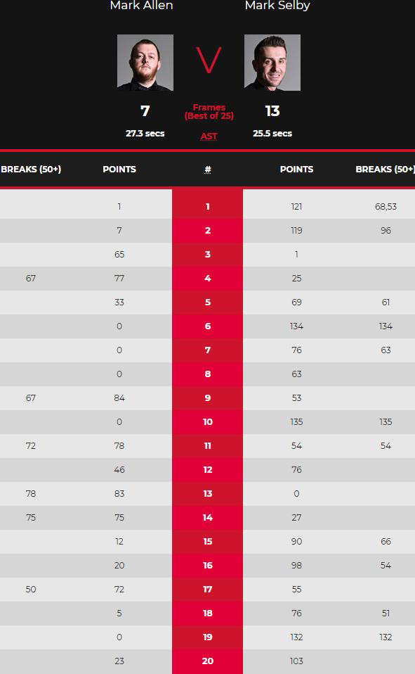 第1局,塞尔比单杆68分单杆53分,以121-1拿下。第2局,塞尔比单杆96分,以119-1拿下。塞尔比2-0。第3局,艾伦65-1拿下。第4局,艾伦单杆67分,以77-25拿下。双方2-2进入局休。
