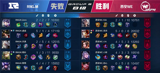 开局RNG.M中路抢线。2分19秒中路团战,不知火舞拿下一血。2分23秒露娜拿下主宰。2分50秒不知火舞被击杀。3分13秒RNG.M下路一塔被破。4分20秒露娜拿下暴君。4分40秒中路团战,RNG.M打出2换3。6分30秒马可波罗推掉下路一塔。7分16秒马超推掉上路一塔。7分50秒露娜拿下主宰。9分钟上路团战,RNG.M打出0换3,马可波罗拿下双杀,RNG.M顺势推掉上路二塔。9分50秒RNG.M拿下暴君。11分钟马可波罗推掉中路一塔。11分20秒西安WE主宰逼团,RNG.M打出0换2。11分35秒鲁班七号击杀阿古朵。13分17秒露娜拿下主宰,马可波罗拿下暴君。14分50秒马超被击杀。16分50秒马可波罗推掉下路二塔。18分10秒下河道团战,双方打出3换3。18分40秒鲁班七号推掉中路一塔。19分钟露娜拿下暴君。19分40秒下河道团战,姜子牙被击杀。20分钟西安WE龙王逼团,猪八戒被击杀。23分10秒中路团战,西安WE打出0换4。23分48秒西安WE顺势一波推掉水晶率先拿到赛点。