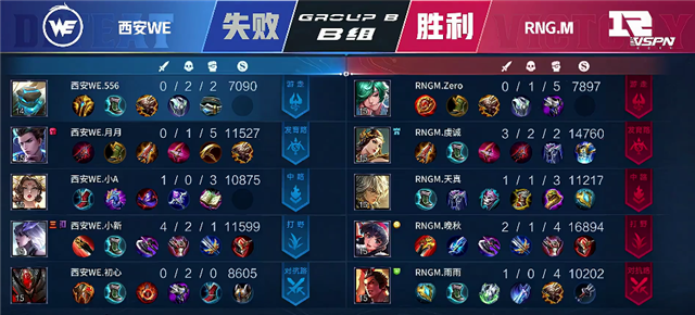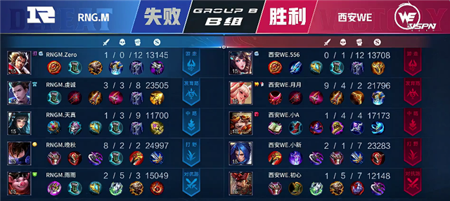 40秒猪八戒入侵野区拿下红Buff,沈梦溪拿下一血。1分25秒沈梦溪入侵野区被击杀。2分钟猪八戒在上路被击杀。2分30秒西安WE拿下暴君。5分50秒下河道发生交火,公孙离被击杀。6分15秒狄仁杰推掉下路一塔。6分50秒公孙离在上路被击杀。7分18秒RNG.M拿下暴君。7分30秒双方互换边路一塔。9分40秒西施被击杀。9分51秒狄仁杰被击杀。10分10秒西安WE推掉中路一塔。10分35秒西安WE拿下暴君。12分12秒西安WE拿下主宰。13分30秒野区交火,双方1换1。14分16秒RNG.M边路二塔被破。15分25秒下河道团战,RNG.M打出0换2。15分55秒猪八戒拿下暴君。16分钟狄仁杰推掉中路一塔和二塔。17分43秒猪八戒被击杀。17分55秒西安WE拿下主宰。21分钟澜拿下风暴龙王。23分30秒上河道团战,西安WE打出2换4,狄仁杰和公孙离分别拿下双杀。24分35秒西安WE推掉上路高地塔。26分钟西安WE拿下风暴龙王。26分45秒西安WE推掉中路高地塔。27分10秒高地团战,猪八戒被击杀。28分10秒野区团战,RNG.M打出0换2,澜拿下双杀。28分55秒RNG.M推掉中路高地塔。29分37秒西安WE进攻RNG.M高地,双方爆发团战。29分52秒RNG.M被超级兵点掉水晶结束本局比赛。