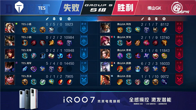 开局TES狄仁杰抢中线。47秒佛山GK反掉红BUFF并反掉红隼。1分59秒双方上路1换1,佛山GK拿到一血。2分08秒TES下路击杀瑶。5分15秒佛山GK拿下主宰,TES摧毁敌方下路外塔。5分48秒TES下路元歌单杀娜可露露。6分41秒TES拿下暴君。7分12秒佛山GK中路击杀娜可露露。7分51秒中路团战佛山GK打出0换2。9分03秒佛山GK中路击杀太乙真人。10分21秒TES拿下暗影主宰。12分28秒佛山GK摧毁敌方下路二塔。12分44秒佛山GK下路击杀太乙真人。13分48秒TES上路击杀娜可露露。14分57秒佛山GK拿下暗影暴君。15分10秒佛山GK下路击杀露娜。15分38秒中路团战佛山GK打出0换3。15分56秒佛山GK摧毁敌方水晶拿下比赛。
