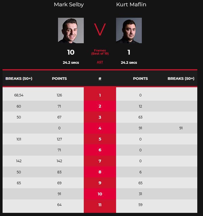 第11局,塞尔比率先建立13-0领先,马福林彻底放弃了比赛,防守超级失误之后,塞尔比拿下本局,10-1晋级!