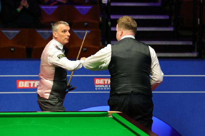 本次墨菲与马克-戴维斯在世锦赛首轮相遇,第1局墨菲单杆62,戴维斯单杆56,墨菲66-56拿下第一局。戴维斯单杆62分以102-1拿下第2局,戴维斯71-13拿下第3局,以2-1反超,墨菲68-16拿下第4局。两人2-2进入局休。