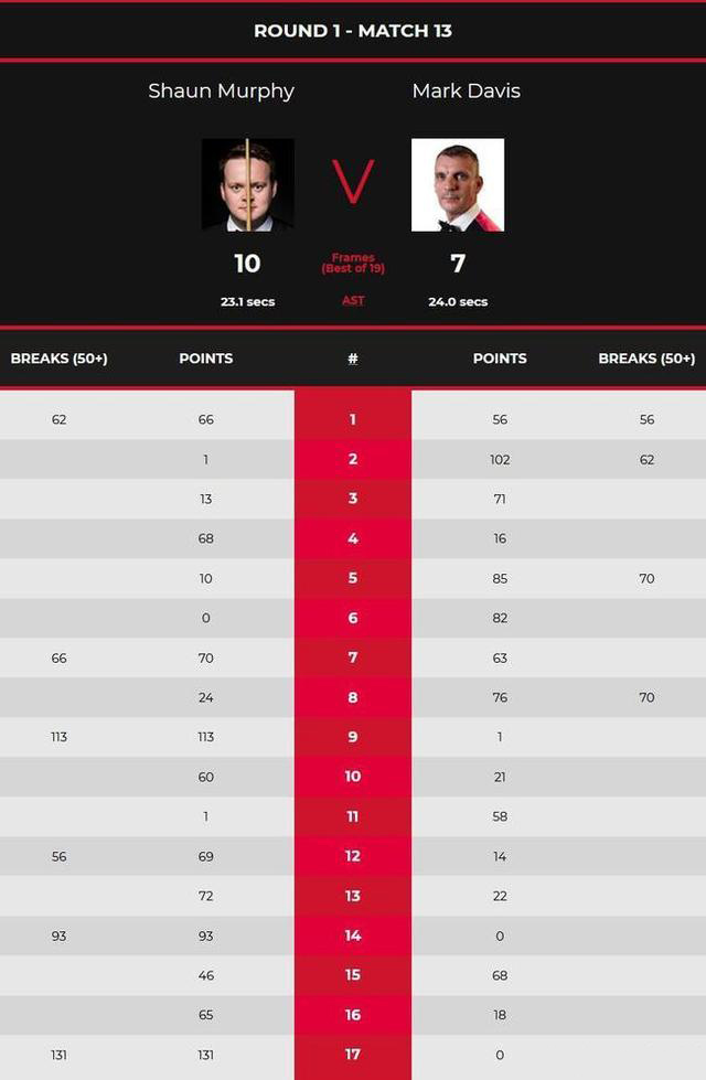 第15局,戴维斯凭借多次上手,以68-46扳回一局。第16局,墨菲通过多次上手,以65-18再胜一局,大比分9-7拿到赛点。第17局,墨菲没有再给戴维斯任何机会,凭借单杆131分,以131-0胜出,大比分10-7晋级第二轮。