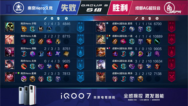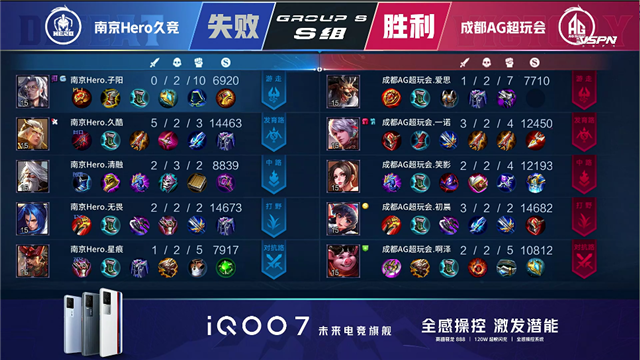 开局双方互抢蓝buff。2分14秒,成都AG拿下先知主宰,随后南京Hero拿下暴君。3分12秒,成都AG张良击杀吕布拿下一血。4分11秒,成都AG反打击杀牛魔。5分55秒,上路团,双方1换1。6分22秒,野区团,成都AG关羽拿下双杀。6分47秒,中路团,双方1换1。8分31秒,成都AG破掉南京Hero上二塔。9分05秒,成都AG控下先知主宰。9分53秒,野区团,成都AG打出1换5团灭对手。10分32秒,成都AG破掉南京Hero上高地。11分钟,河道团,成都AG打出3换4。12分28秒,成都AG拿下暗影暴君。12分52秒,成都AG破掉南京Hero下二塔。13分30秒,成都AG破掉南京Hero中高地并团灭对手,兵线到达后一举摧毁水晶赢下比赛!