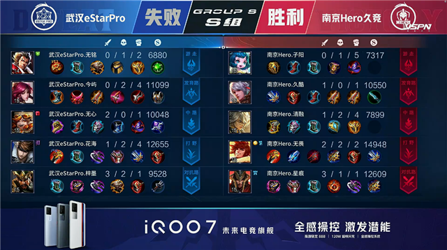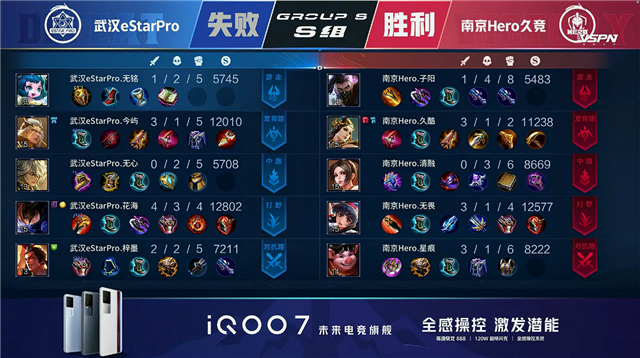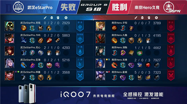 开局南京Hero入侵野区未果。1分24秒武汉ES入侵野区张飞抢到红BUFF。3分04秒武汉ES抢到暴君。4分16秒野区团战武汉ES打出0换2,关羽拿到一血。5分10秒武汉ES中路击杀裴擒虎。5分40秒武汉ES上路击杀张良。5分53秒武汉ES摧毁敌方下路外塔。6分36秒武汉ES拿下主宰。8分31秒武汉ES拿下暴君。8分41秒南京Hero野区击杀张飞。8分55秒南京Hero摧毁敌方中路外塔,随后暴君处击杀关羽。9分19秒南京Hero摧毁敌方下路外塔。9分38秒武汉ES摧毁敌方上路外塔。9分52秒武汉ES野区击杀蒙恬。10分25秒武汉ES拿下暗影暴君。11分28秒上路团战南京Hero打出0换2。11分55秒南京Hero摧毁敌方上路二塔。12分10秒南京Hero拿下暗影主宰。13分13秒南京Hero摧毁敌方下路二塔。13分19秒南京Hero摧毁敌方中路二塔。14分51秒武汉ES抢到暗影暴君,南京Hero团战击杀伽罗。15分47秒南京Hero摧毁敌方中路高地塔。16分28秒南京Hero拿下暗影主宰。17分15秒南京Hero野区击杀关羽。17分22秒南京Hero摧毁敌方下路高地塔。17分42秒南京Hero摧毁敌方水晶拿下比赛。