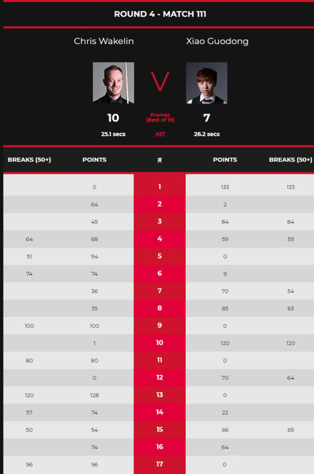 第17局,韦克林没有给肖国栋反击机会,他打出单杆96分,96-0锁定胜局,总比分10-7晋级世锦赛正赛,肖国栋则非常遗憾地无缘世锦赛正赛!
