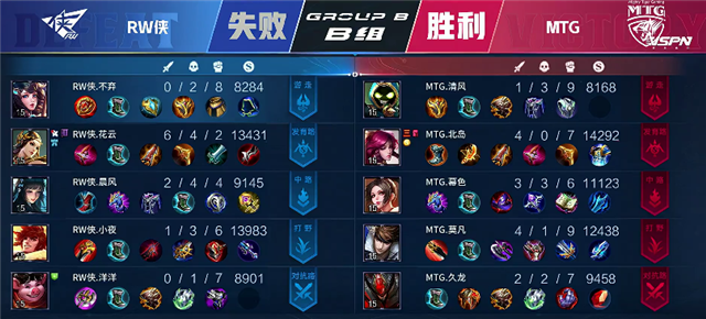 双方平稳开局。1分钟中路河道之灵团战,狄仁杰拿下一血。2分20秒橘右京拿下暴君,太乙真人被击杀。2分53秒橘右京反下蓝buff。4分40秒狄仁杰推掉下路一塔。5分43秒沈梦溪被击杀。6分钟橘右京拿下主宰。6分10秒RW侠强攻中路一塔,团战RW侠打出1换2。8分钟MTG上路一塔被破。8分47秒橘右京推掉下路一塔,狄仁杰推掉上路一塔。10分10秒中路下河道团战,盾山被击杀。11分钟暴君团,太乙真人被击杀,猪八戒拿下暴君。12分20秒RW侠上路二塔被破。12分35秒中路团战,RW侠打出0换2。13分22秒橘右京拿下主宰。14分35秒下河道团战,双方1换1。15分28秒MTG拿下暴君。15分50秒野区团战,MTG打出1换4,马超拿下双杀,MTG顺势推掉中路防御塔。16分57秒RW侠上路高地塔被破。18分钟野区团战,MTG打出0换2。19分钟MTG拿下主宰。19分30秒上路团战,RW侠打出3换4,马超和蒙犽分别拿下双杀。20分钟RW侠推掉中路一塔。21分20秒下河道团战,MTG打出0换4,马超拿下双杀。22分10秒MTG推掉水晶追回一分。