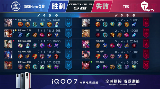 2分26秒,TES拿下先知主宰,南京Hero拿下暴君。2分47秒,南京Hero马超击杀王昭君拿下一血,3分30秒,南京Hero马超下路再次击杀王昭君。4分42秒,南京Hero马超下路击杀盾山。5分45秒,TES破掉南京Hero下一塔。6分03秒,中路团,双方1换1。7分03秒,南京Hero拿下暴君。7分38秒,TES击杀赵云。8分57秒,TES拿下先知主宰随后击杀赵云。9分38秒,中路团,双方1换1。10分17秒,TES拿下暗影暴君。10分30秒,中路团,王昭君拿下双杀,TES破掉南京Hero中路两座外塔。12分17秒,TES拿下暗影主宰。13分21秒,TES破掉南京Hero下二塔。14分30秒,TES拿下暗影暴君,随后团战1换1。15分钟,下路团,南京Hero打出1换4团灭TES。15分40秒,南京Hero破掉TES上高地。17分钟,南京Hero赵云抢到暗影主宰。18分45秒,南京Hero拿下暗影暴君。20分06秒,TES盾山开到孙膑将其击杀。20分38秒,双方团战1换1。22分58秒,龙王团,双方1换1。25分36秒,双方团,南京Hero拿下风暴龙王,随后团战南京Hero打出0换5团灭对手,马可波罗拿下四杀。26分03秒,南京Hero一波摧毁TES水晶拿到赛点。