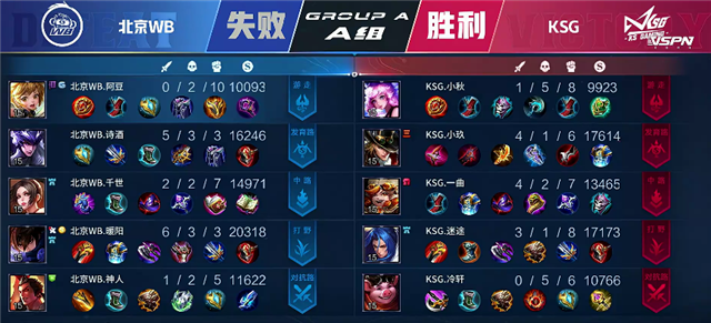 双方平稳开局。1分钟中路河道之灵争夺战,蒙犽拿下一血。1分46秒嬴政被周瑜击杀。2分19秒娜可露露拿下主宰。2分24秒吕布被镜击杀。2分55秒下路团战,蔡文姬被击杀。4分39秒镜在上路单杀吕布。4分46秒娜可露露拿下暴君。6分钟中路团战北京WB打出0换2。6分17秒北京WB下路一塔被破。6分40秒中路再次团战,蔡文姬被击杀。7分50秒蒙犽推掉上路一塔。8分钟镜推掉下路一塔。8分58秒娜可露露拿下暴君。10分钟中路河道团战北京WB打出0换2。10分40秒娜可露露拿下主宰,镜拿下暴君。11分24秒KSG上路一塔被破。11分46秒下河道团战,KSG2换5团灭北京WB,周瑜和娜可露露分别拿下双杀。12分钟KSG推掉中路一塔。13分37秒北京WB上路二塔被破。14分26秒河道团战,北京WB打出0换3,北京WB顺势推掉中路一塔河二塔。16分钟镜拿下主宰。19分钟KSG下路高地塔被破。19分50秒野区团战,蒙犽被击杀,北京WB顺势推掉中路高地塔。20分42秒北京WB拿下风暴龙王。21分30秒北京WB强攻高地,KSG打出1换3。KSG上路高地塔被破。23分钟河道团战,KSG打出0换2,蒙犽拿下双杀。KSG顺势推掉中路一塔和二塔。24分50秒风暴龙王团,北京WB打出0换4。25分22秒北京WB攻破水晶追回一分。