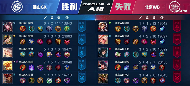 双方平稳开局。1分10秒廉颇入侵野区拿下红buff。2分25秒镜拿下暴君。3分钟廉颇入侵野区再次抢下红buff。4分10秒镜拿下主宰。4分50秒北京WB入侵野区,镜拿下一血。5分45秒北京WB强攻上路一塔,镜拿下双杀,佛山GK一塔被破。6分50秒下河道团战,佛山GK打出0换2。7分31秒佛山GK下路一塔被破。9分35秒北京WB强攻下路二塔,团战打出1换1。9分54秒北京WB推掉中一塔。11分钟镜拿下暴君。12分23秒野区团战,鬼谷子被击杀,镜拿下主宰。14分10秒北京WB推掉中路二塔。15分12秒镜拿下暴君。16分53秒镜拿下主宰。17分23秒北京WB强攻上路高地塔,不知火舞被击杀。18分15秒上河道团战北京WB打出0换3。北京WB顺势强攻高地,19分10秒北京WB攻破水晶追平比分。