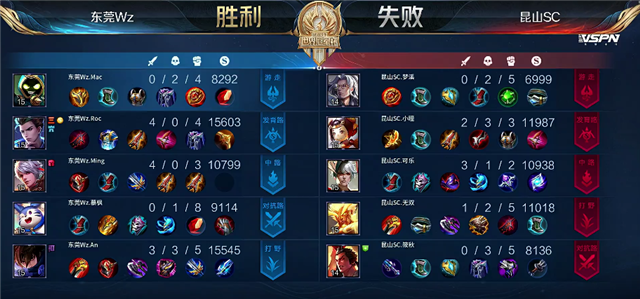双方平稳开局。1分50秒上河道交火,嬴政拿下一血。4分钟盘古拿下暴君,太乙真人被击杀。4分30秒鲁班七号推掉下路一塔。6分08秒吕布被击杀。6分17秒狄仁杰推掉下路一塔。6分55秒澜拿下主宰。7分44秒狄仁杰推掉下路二塔。8分钟野区团战,双方1换1。9分10秒澜推掉上路一塔。9分35秒梦奇拿下暴君。10分钟中路团战,东莞Wz打出1换4,狄仁杰拿下三杀。10分20秒狄仁杰推掉中路一塔。12分55秒澜拿下暴君。14分05秒澜推掉下路高地塔。15分钟狄仁杰拿下主宰。16分10秒高地团战,昆山SC打出0换2,但上路和中路高地塔被破。17分03秒昆山SC推掉中路一塔。17分20秒盘古拿下暴君。17分30秒中路团战,东莞Wz打出0换2。18分05秒东莞Wz推掉水晶拿下本场比赛胜利。