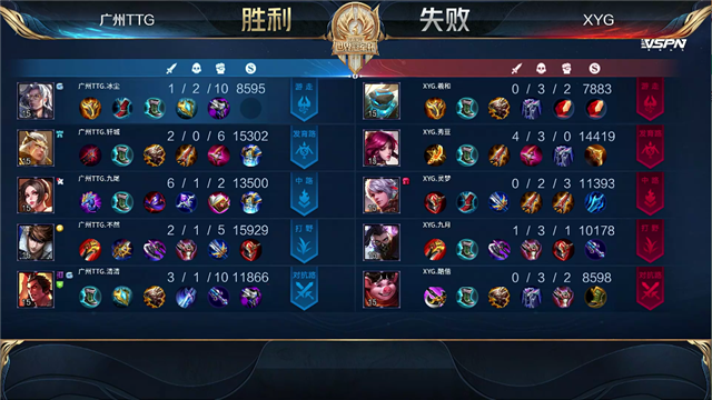 2分18秒,XYG拿下暴君,随后广州TTG不知火舞击杀百里守约拿下一血。2分58秒,XYG伽罗击杀鲁班大师。3分46秒,广州TTG不知火舞击杀兰陵王。4分09秒,广州TTG拿下先知主宰。6分49秒,广州TTG赵云上路击杀猪八戒。7分12秒,广州TTG拿下暴君。8分06秒,广州TTG破掉XYG上一塔。8分29秒,野区团,广州TTG打出0换3。8分49秒,广州TTG破掉XYG中一塔。9分49秒,广州TTG破掉XYG上二塔,XYG将吕布击杀。10分46秒,广州TTG拿下暗影暴君。12分22秒,广州TTG破掉XYG下二塔。12分56秒,广州TTG拿下暗影主宰。14分09秒,广州TTG越下高地塔击杀盾山。16分36秒,广州TTG破掉XYG中二塔。15分04秒,广州TTG拿下暗影暴君。15分53秒,广州TTG破掉下高地,双方团战1换1。17分25秒,广州TTG拿下暗影主宰。19分24秒,上路团,广州TTG打出2换5团灭对手,随后一波摧毁XYG水晶。