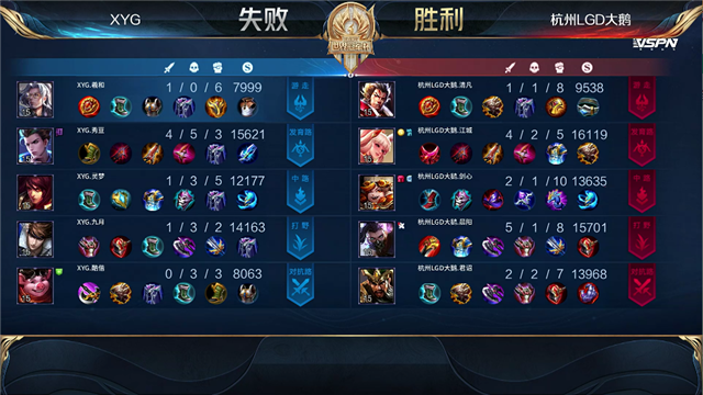 2分12秒,XYG控下暴君。3分15秒,杭州LGD沈梦溪击杀猪八戒拿下一血。3分52秒,杭州LGD击杀周瑜。4分25秒,杭州LGD拿下先知主宰。5分37秒,XYG中路击杀关羽。6分27秒,双方团战1换1。8分45秒,杭州LGD拿下先知主宰。10分28秒,杭州LGD拿下暗影暴君,但XYG击杀关羽。11分28秒,杭州LGD团战击杀赵云。12分30秒,双方团战2换2。14分35秒,杭州LGD兰陵王击杀赵云。15分05秒,杭州LGD关羽越塔推人,XYG极限1换1,但随后杭州LGD破掉XYG上二塔。15分55秒,杭州LGD团战打出0换2。16分15秒,杭州LGD破掉XYG中二塔。17分03秒,杭州LGD拿下暗影主宰。17分48秒,XYG击杀公孙离。18分43秒,杭州LGD击杀狄仁杰。19分34秒,杭州LGD破掉XYG上高地。20分53秒,杭州LGD拿下风暴龙王。21分44秒,杭州LGD破掉XYG下高地。22分22秒,杭州LGD击杀三人后破掉XYG水晶。