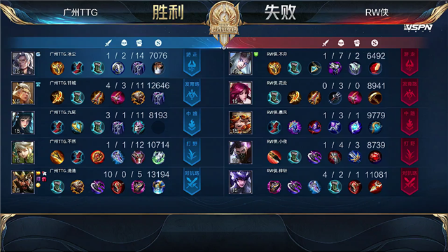 1分35秒广州TTG击杀沈梦溪拿下一血,2分30秒RW侠拿下暴君。4分36秒RW侠拿下先知主宰,5分钟中路团广州TTG击杀东皇太一。6分30秒团战广州TTG西施双杀,拆掉RW侠上路一塔。7分钟中路团RW侠打出0换2,8分21秒团战双方1换1。10分32秒团战广州TTG打出1换2,11分55秒团战广州TTG击杀东皇太一。11分20秒广州TTG拿下暗影暴君,打出1换3。13分28秒广州TTG击杀沈梦溪,13分50秒广州TTG拆掉RW侠中路二塔。15分35秒广州TTG击杀兰陵王,16分钟中路团广州TTG打出1换3。16分24秒广州TTG拆掉RW侠中路高地,击杀沈梦溪一波拆掉水晶。