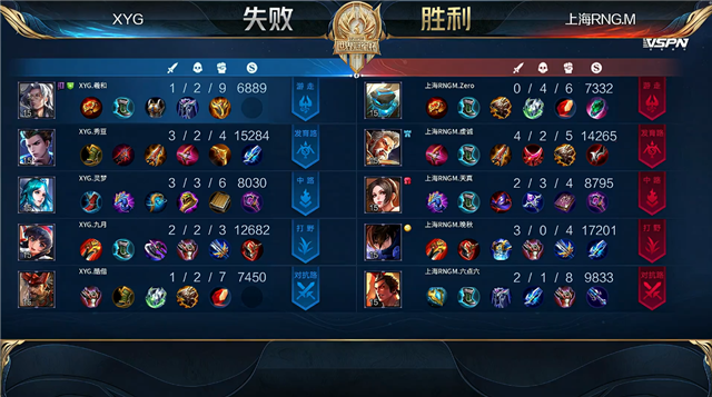 双方常规开局。1分09秒上海RNG.M拿下中路河道之灵。2分12秒上海RNG.M拿下主宰。6分20秒上海RNG.M摧毁敌方上路二塔。6分50秒上海RNG.M摧毁敌方下路外塔。7分32秒野区团战双方2换2。8分17秒上海RNG.M摧毁敌方中路外塔。8分38秒上海RNG.M拿下暴君。9分05秒上海RNG.M摧毁敌方下路二塔。10分13秒上海RNG.M拿下暗影主宰。10分38秒上海RNG.M摧毁敌方中路二塔。11分22秒上海RNG.M摧毁敌方上路高地塔。11分45秒上海RNG.M野区击杀狄仁杰。12分13秒中路团战上海RNG.M打出2换3并破掉敌方三路高地塔。13分53秒上海RNG.M拿下暗影暴君。14分09秒XYG野区击杀盾山。14分51秒中路团战XYG打出0换2。15分31秒XYG拿下暗影主宰。17分27秒野区团战上海RNG.M打出2换3。18分07秒上海RNG.M摧毁敌方水晶拿下比赛。
