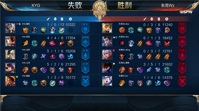 双方常规开局。6分17秒XYG野区击杀鲁班七号拿到一血。6分39秒中路团战双方1换1。8分01秒野区团战东莞Wz打出1换2,狄仁杰拿到二连击破。8分47秒XYG主宰处打出0换2。9分04秒双方中路射手互换。10分14秒东莞Wz拿下暗影暴君。10分24秒中路团战双方1换1。11分55秒东莞Wz拿下暗影主宰。12分10秒野区团战XYG打出1换2。14分25秒XYG拿下暗影暴君。15分54秒中路团战XYG击杀梦奇。19分22秒东莞Wz拿下暗影暴君。20分22秒XYG主宰处击杀梦奇。21分12秒野区团战XYG击杀澜。22分07秒XYG野区击杀孙膑。24分40秒XYG击杀澜,东莞Wz拿下风暴龙王。26分05秒东莞Wz中路打出0换2。26分15秒XYG摧毁敌方上路高地塔。26分40秒双方高地2换2。26分50秒东莞Wz摧毁敌方水晶拿下比赛。
