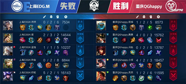 开局重庆QGhappy三路换线。2分11秒露娜拿下暴君。3分40秒重庆QGhappy入侵野区,周瑜拿下一血。4分13秒李元芳推掉上路一塔,同时拿下双杀。5分17秒上海EDG.M拿下主宰。5分55秒中路上河道团战,马超被击杀。6分13秒重庆QGhappy推掉下路一塔。7分钟上海EDG.M推掉下路一塔。7分33秒中路团战,重庆QGhappy打出0换2。8分10秒中路上河道再次团战,周瑜被击杀。8分47秒重庆QGhappy推掉中路一塔。9分50秒重庆QGhappy拿下主宰。10分10秒重庆QGhappy强攻高地塔,团战打出1换4,同时重庆QGhappy推掉中路高地塔。11分24秒猪八戒拿下暴君。12分05秒重庆QGhappy推掉下路高地塔。12分30秒野区团战,上海EDG.M打出0换3。13分14秒狄仁杰推掉中路一塔。14分30秒中路二塔处团战,太乙真人被击杀。14分46秒重庆QGhappy强攻水晶率先拿下一局。