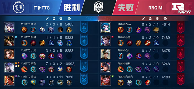 双方中路和边路换线开局。3分钟RNG.M拿下暴君,双方团战广州TTG打出0换2,张飞拿下一血。5分30秒广州TTG强攻中路一塔,双方打出2换2。6分51秒广州TTG推掉下路一塔。7分55秒虞姬推掉上路一塔。8分12秒中路团战,广州TTG打出0换3,关羽拿下双杀。9分17秒赵云拿下主宰。10分20秒中路下河道团战,双方打出二换二。12分28秒赵云拿下暴君。12分43秒广州TTG推掉中路一塔。13分57秒广州TTG推掉中路二塔。14分50秒橘右京被击杀。15分26秒貂蝉被击杀,15分30秒中路高地塔被破。15分35秒广州TTG强攻水晶,RNG.M打出2换4。17分40秒RNG.M推掉中路一塔。19分钟野区团战,双方打出1换1。21分45秒RNG.M拿下风暴龙王。22分36秒RNG.M推掉下路二塔。27分钟RNG.M推掉中路二塔。27分48秒橘右京被击杀。28分钟野区团战,张飞被击杀。31分钟中路团战,RNG.M打出0换2。32分15秒橘右京拿下风暴龙王。33分33秒虞姬推掉下路高地塔,33分45秒RNG.M再次推掉中路高地塔。34分55秒RNG.M推掉上路高地塔。36分20秒中路上河道团战,RNG.M打出1换2,虞姬拿下双杀。37分22秒RNG.M强攻水晶拿下本场比赛胜利。