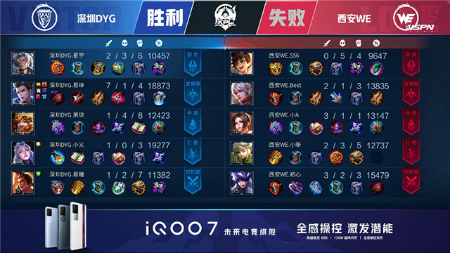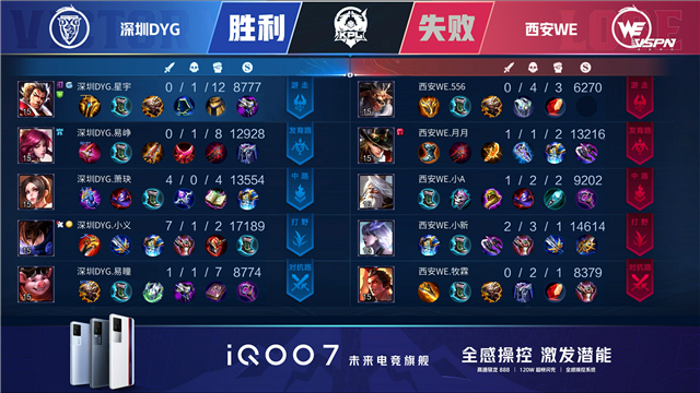 双方和平开局,3分46秒深圳DYG拿下第一条暴君,西安WE拿下先知主宰。4分33秒中路团深圳DYG鲁班大师击杀刘禅拿下一血,5分01秒深圳DYG拆掉西安WE下路一塔。6分钟上路团双方1换1,6分38秒西安WE不知火舞双杀,8分11秒西安WE拿下先知主宰。10分30秒暴君团西安WE打出0换4,11分10秒西安WE拿下暗影暴君。12分46秒深圳DYG击杀不知火舞,13分30秒上路团深圳DYG双方1换1,深圳DYG拆掉西安WE上路二塔。15分49秒深圳DYG拿下暗影暴君,16分25秒深圳DYG拆掉西安WE下路二塔。17分33秒西安WE拿下暗影主宰,20分钟下路团战深圳DYG打出0换3。20分41秒深圳DYG拆掉西安WE下路高地,22分钟团战深圳DYG打出2换4,狄仁杰拿到四杀。23分钟深圳DYG击杀不知火舞团灭西安WE,一波拆掉其水晶拿下胜利。