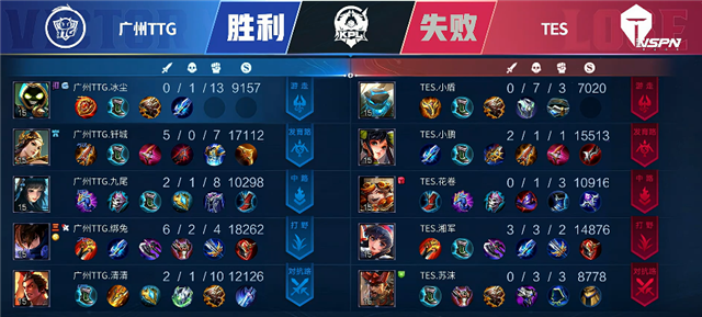 双方平稳开局。娜可露露拿下中路1分钟河道之灵。2分16秒,澜拿下主宰。2分28秒,娜可露露拿下暴君。4分23秒,澜反掉娜可露露蓝buff。4分45秒,TES推掉上路一塔。6分15秒,广州TTG进攻蓝区,虞姬拿下一血。6分50秒广州TTG下路一塔被破。6分57秒,娜可露露拿下主宰。9分17秒澜入侵红区,双方打出1换1。10分10秒中路团战,双方打出1换1。10分45秒,上路娜可露露被澜单杀。11分40秒暴君团,盾山被击杀,澜拿下暴君。11分56秒,TES中路一塔被破。13分06秒,澜拿下主宰。14分钟广州TTG强攻下路二塔,打出0换2。15分钟,广州TTG强攻上路二塔,盾山被击杀,TES二塔被破。15分50秒,中路二塔处澜被娜可露露单杀。16分钟,娜可露露拿下暴君。17分20秒,孙尚香推掉中路一塔。17分40秒娜可露露拿下主宰,同时双方爆发团战,广州TTG打出0换2。19分57秒,中路下河道团战,广州TTG打出1换5,澜拿下三杀。20分45秒,广州TTG攻破TES水晶拿下本场比赛胜利。