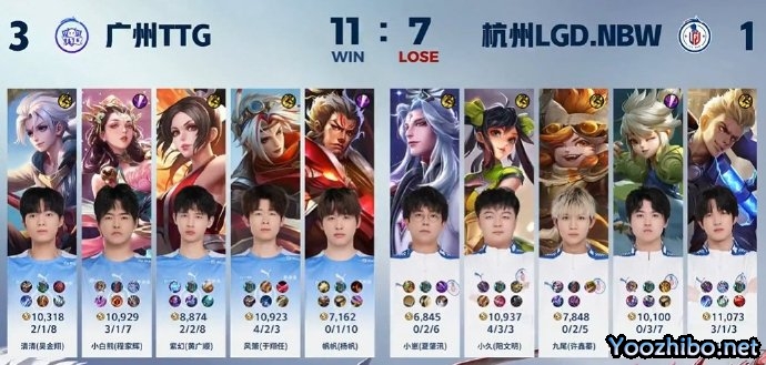 第二局交手,双方中路的差距就体现出来了,LGD九尾这边选择了王昭君,这也不是九尾擅长的英雄,所以打得就很一般了,技能命中率不是很高,先丢掉了一血,被TTG清清直接切掉。反观TTG的紫幻,一手沈梦溪压制力就打了出来,最终战绩6-0-6,输出占比高达41%,尤其是8分钟和10分钟的两波团战,紫幻沈梦溪都贡献很大,收获了“三杀”!