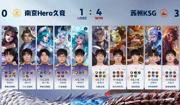 4分10秒,苏州KSG轻语 (谢欣臻)孙策在暴君团找到机会,收下赵怀真和王昭君,拿到二连击破。中期苏州KSG强势入侵,南京Hero久竞不断交出大招,苏州KSG接连收下南京Hero久竞中下一塔,双方经济差来到6K。11分30秒,苏州KSG拔掉南京Hero久竞三座高地塔。13分20秒,苏州KSG打出1换1,借助兵线优势,一波点掉南京Hero久竞的水晶,获得本场比赛的胜利。