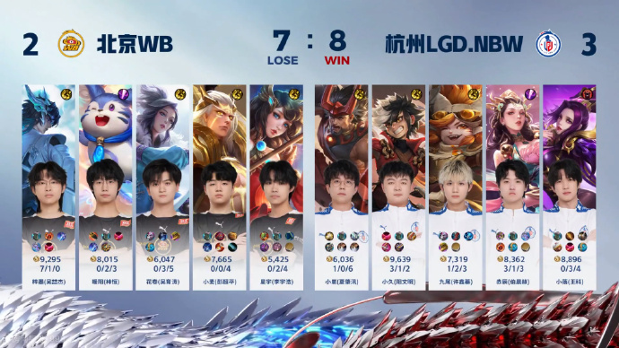 杭州 LGD.NBW 在这一局中显得有些着急,而北京 WB 的暖阳使用典韦对公孙离构成了极大威胁,小麦的孙尚香也打出了高额伤害。