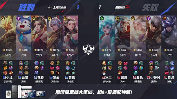 第三局,EDGM下路太乙闪炸反被WE张良捏住,但此时关羽绕后反劈进场收割打出四连超凡携队友点掉高地,下路龙兵进入点掉水晶拿下胜利,抢先来到赛点!本局MVP为上海EDGM小泽 (沈宇泽)关羽!