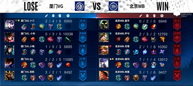 2分10秒下路团战,虞姬拿下一血。3分钟下路团战,虞姬被击杀。4分30秒刘邦被击杀。5分钟镜拿下暴君。5分18秒虞姬推掉下路一塔。5分30秒西施被击杀。6分钟虞姬被击杀。6分钟上路团战,双方1换1。7分钟镜推掉中路一塔,关羽被击杀。8分钟镜拿下主宰。9分钟下路团战,北京WB打出1换4。9分40秒镜拿下暴君。11分钟中路团战,双方2换2,澜拿下主宰。13分钟镜拿下暴君。14分钟镜拿下主宰,澜拿下暴君。15分20秒中路团战,北京WB1换4团灭厦门VG。15分52秒北京WB推掉水晶拿下本场比赛胜利。