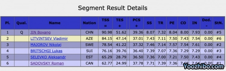 中国选手金博洋第一组第五位出场,他的个人赛季最佳是97.89分。本赛季他短节目的音乐是平昌冬奥会上选用过的《卧虎藏龙》,开场勾手四周接后外点冰三周、后外点冰四周顺利做成,节目后半段的阿克塞尔三周落冰双足步伐滑出,三个旋转和一套接续步伐都是四级,技术分51.62、节目内容分39.36、短节目得到了90.98分,目前暂时排名第一位。