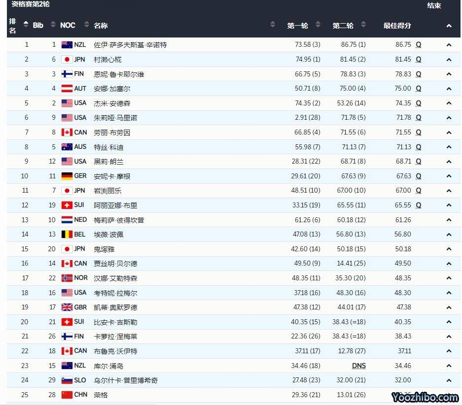 第二轮资格赛开始,鲁卡耶尔维调整状态后发挥出色,她得到了78.83的高分,也让她来到了第一的位置,而后辛诺特得到86.75分排在第二位,之后的选手也都纷纷拿出了不错的状态。而安德森也出现了比较明显的失误,只拿到53.26分,没能超过第一轮的分数,排名也瞬间下滑。