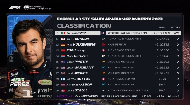 24直播网讯 北京时间03月20日,2023年F1沙特大奖赛正式比赛在吉达赛道结束,红牛车队佩雷兹从杆位发车,虽然在发车阶段被阿隆索超越,但随后很快完成反超,之后一路领跑,成功拿到冠军!他也连续两个赛季称霸吉达滨海赛道!从第15位发车的维斯塔潘最终收获亚军!阿隆索第3个冲过终点线,赛后他因为违规进站而被加罚10秒丢掉季军,之后阿斯顿马丁车队又通过上诉成功帮助头哥重拾季军奖杯。梅赛德斯车队拉塞尔拿到第3名。