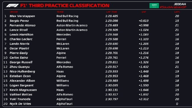 2023年F1沙特大奖赛第3次练习赛成绩表: