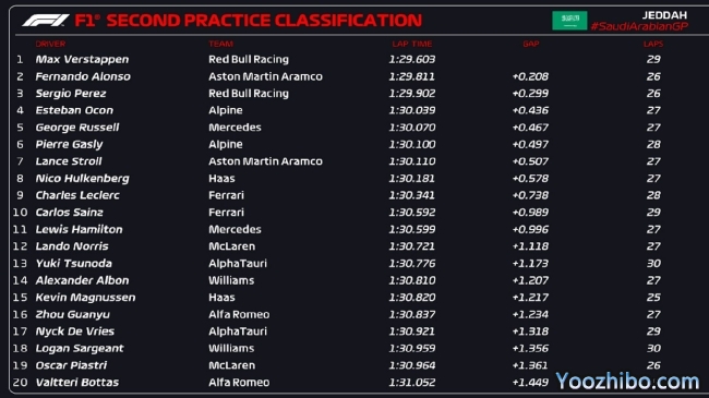 24直播网讯 北京时间03月17日,2023年F1沙特大奖赛第2次练习赛结束,红牛车队维斯塔潘依旧第一,并且做出了1:29.603的周五最快单圈,阿斯顿马丁车队阿隆索落后0.208秒位列第二,佩雷兹第三,前三再次被他们三人包揽。