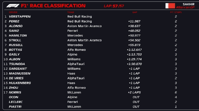 24直播网讯 2023年F1巴林大奖赛正式比赛结束,红牛车队维斯塔潘杆位发车几乎领跑全场,轻松获得赛季开门红!他的队友佩雷兹同样稳定发挥,拿到第二,红牛赛季揭幕战一二带回!阿隆索取得季军,代表阿斯顿·马丁车队的首场比赛就登上了领奖台!这也是他生涯第99个F1领奖台!