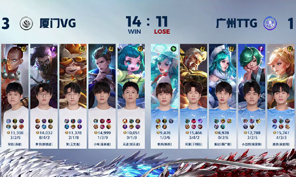 10分20秒,厦门VG拿到暗影暴君,掌握局面节奏。11分20秒,厦门VG击杀对方三个核心输出点,推掉中下高地。13分10秒,厦门VG再度击杀公孙离,高地前五打四,直接推掉水晶,率先来到赛点!
